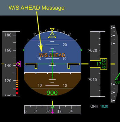 Meanwhile, the predictive windshear indication on the PFD is displayed as "W/S AHEAD" and appears in different colors, either red or amber, depending on whether it is a predictive warning or caution.