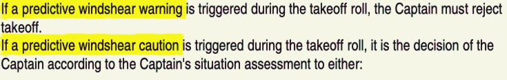 Now, what about predictive windshear warnings, such as "windshear ahead"? These predictive windshear alerts, including warnings and cautions, are inhibited when the aircraft's speed is above 100 knots and up to 50 feet. So, if such an alert occurs, it will be when the speed is below 100 knots. In this case, the FCTM specifies that the captain must reject takeoff, which makes sense because if the speed is below 100 knots, rejecting takeoff is generally a safer option.