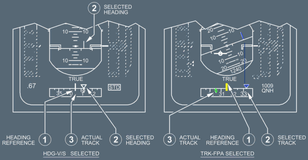 Green bird and the selected blue track on the attitude indicator, along with the green track on the heading reference at the bottom, always align with each other.