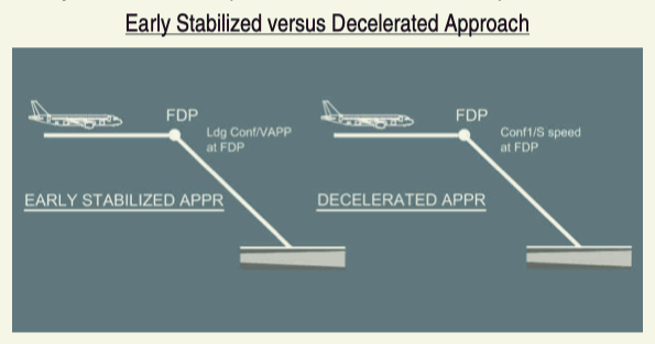 This technique refers to an approach where the aircraft reaches the FDP in the landing configuration at VAPP. This technique is recommended for non-precision approaches (LOC FPA, NAV FPA and TRK FPA).
