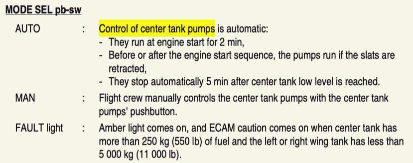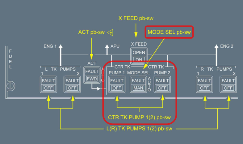 If you refer to the Flight Crew Operating Manual (FCOM), the MODE SEL PB is used in certain procedures, such as addressing center tank transfer faults or low center tank pump pressure.