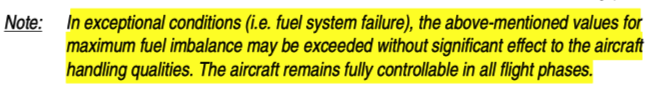 Even though there is a limitation on the maximum allowed fuel imbalance as specified in the FCOM, there is a note indicating that, in exceptional conditions such as fuel system failure, the stated values for maximum fuel imbalance may be exceeded without significantly affecting the aircraft's handling qualities