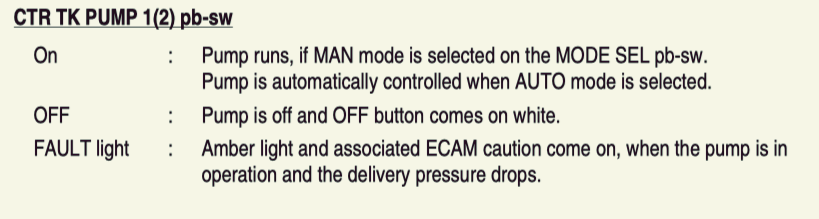 Flight crew manually controls the center tank pumps with the center tank pumps' pushbutton.
