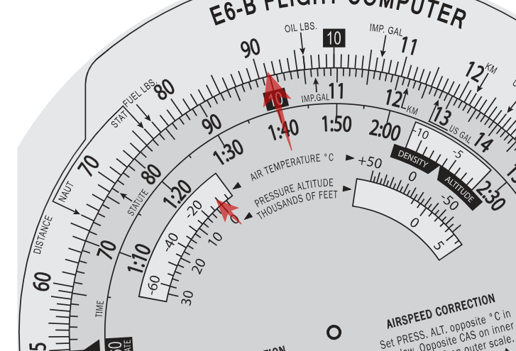 Once we have the pressure altitude on the inner scale as indicated by the aircraft altimeter, we can then read the true altitude on the outer scale.