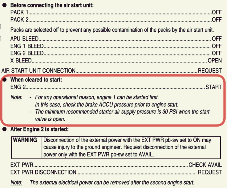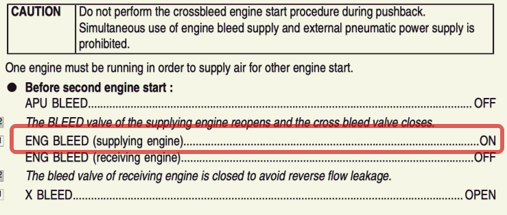 For example, if there is an Engine 1 bleed system malfunction, Engine 2 needs to be started first at the gate.