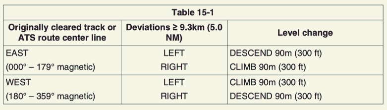 for deviations greater than, or equal to 5.0 NM, from the originally cleared track or ATS route, when the aircraft is approximately 5.0 NM from track, initiate a level change in accordance with Table 15-1;