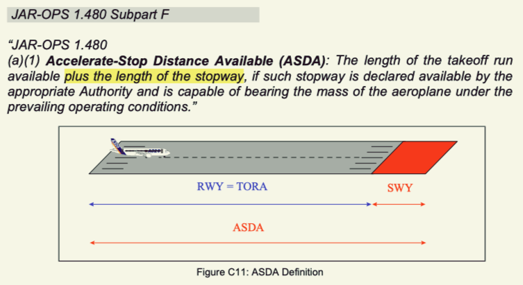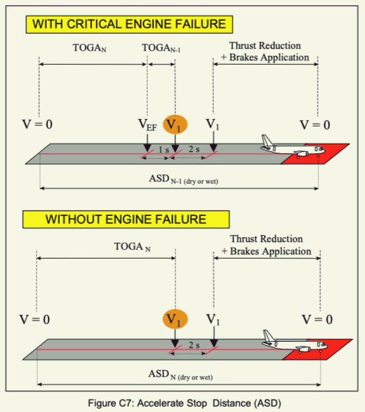 However, in reality, runways are always limited in length, and aircraft require a certain distance to stop. Therefore, the decision speed (V1) must be reduced. This reduction is necessary to accommodate the required distance for an accelerated stop. This distance is known as the Accelerated Stop Distance (ASD). Since the ASD is limited, V1 needs to be adjusted accordingly. This is why ASD includes the length of the stopway if the runway has one.