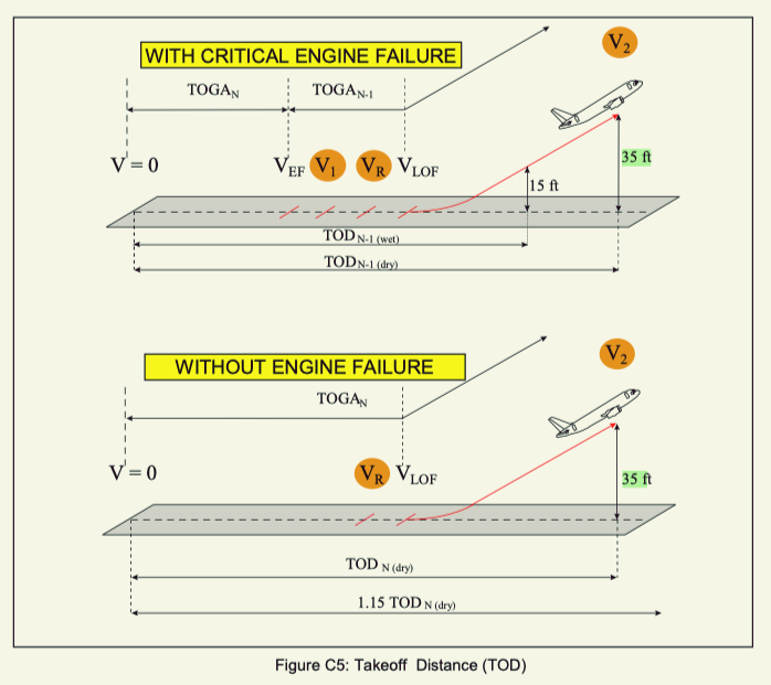 Additionally, the aircraft also requires distance to become airborne. In regulatory terms, takeoff distance usually refers to the distance required to climb to 35 feet above the takeoff surface.