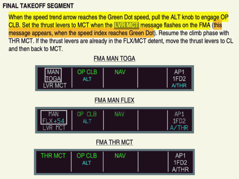 According to FCTM, when the speed trend arrow reaches the Green dot speed, Pull the Alt Knob to engage OP CLM, and set the thrust levers to MCT when the LVR MCT message flashes on the FMA.