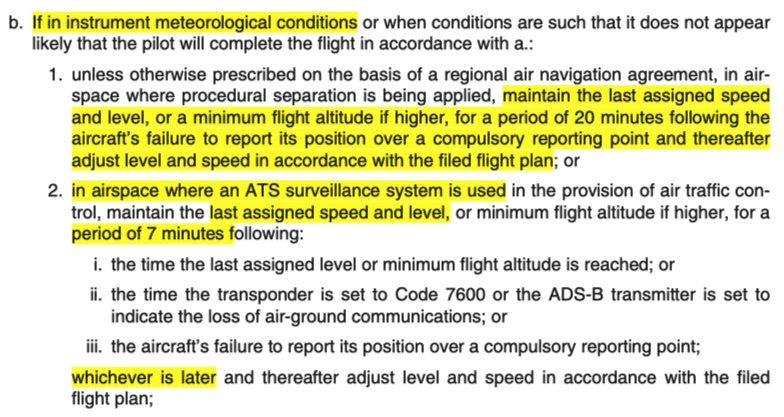 In Instrument Meteorological Conditions (IMC), aircraft should maintain their last assigned speed and altitude or, if higher, the minimum flight altitude for 20 minutes in a non-radar environment or 7 minutes in a radar environment.