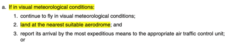 In Visual Meteorological Conditions (VMC), aircraft should maintain VMC conditions and proceed to land at the nearest suitable aerodrome. However, it's important to note that commercial aircraft typically operate at high altitudes where VMC conditions may not be present. Therefore, there is no guarantee of VMC conditions until the aircraft descends and lands.