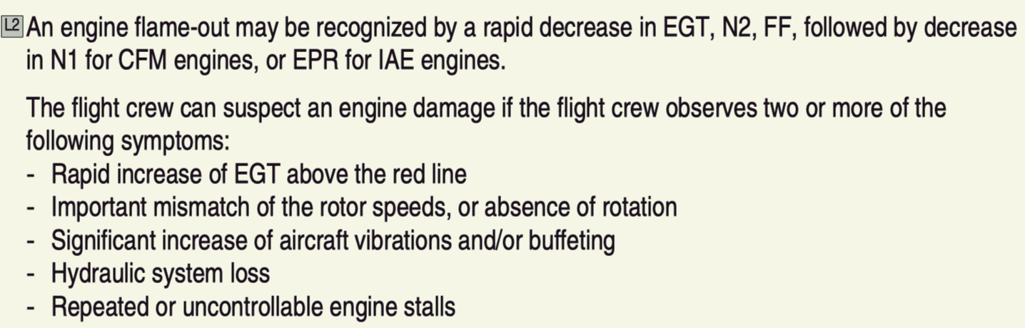 In airbus fcom and FCTM. it says crew can SUSPECT the engine damage if the flight crew observes TWO or MORE of the following symptoms.