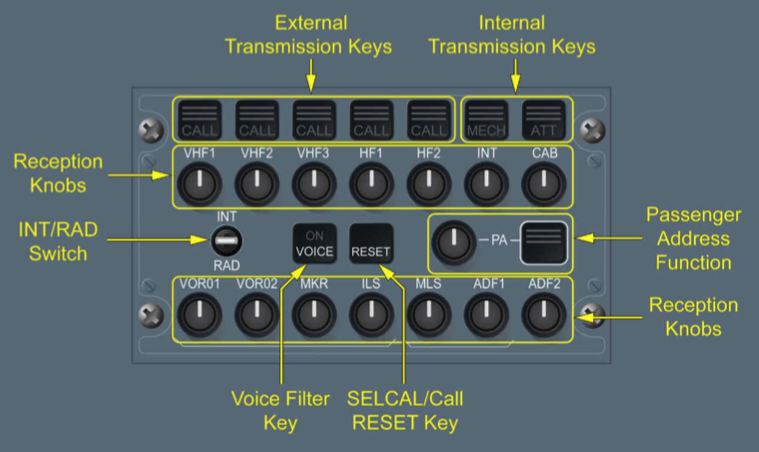 Except for HF devices, aircraft usually have VHF1 and VHF2. Pilots can tune VHF frequencies using the Radio Management Panel (RMP). The RMP allows pilots to select and adjust the desired communication frequencies. Through the Audio Control Panel (ACP), pilots can choose which communication equipment they are using. The ACP enables pilots to select and manage the audio sources for communication and navigation, deciding which radios to listen to and transmit on, as well as adjusting audio levels for each source.