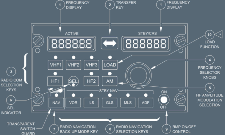 RMP (Radio Management Panel) is the device used to tune frequencies for radios like VHF1, VHF2, HF1, and others. The ACP (Audio Control Panel) is the device that manages audio communication, allowing the selection of various communication channels, adjusting volume, and managing transmissions and receptions from radios and interphone systems .