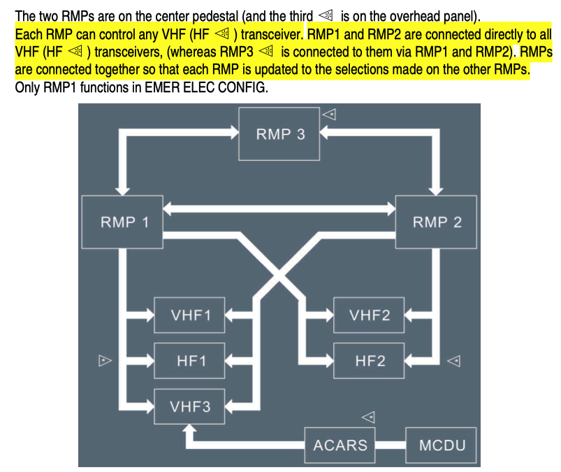 Each RMP can control any VHF transceiver. RMP1 and RMP2 are connected directly to all VHF transceivers, (whereas RMP3 is connected to them via RMP1 and RMP2).