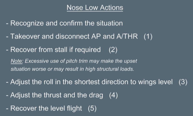 The Nose high/Nose low techniques represent a logical progression for recovering the aircraft. They are not necessarily procedural. The sequence of actions is for guidance only and represents a series of options for the pilot to consider and to use depending on the situation. The flight crew may apply these actions or part of these actions, mainly if the recovery is effective.