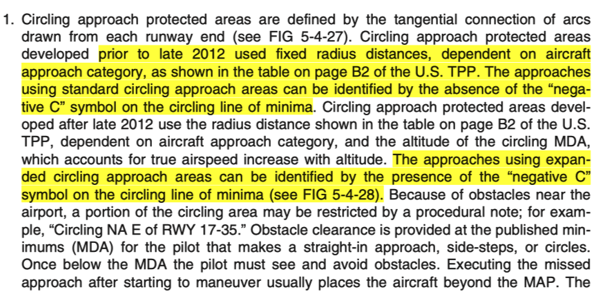 Instrument Approach Minimums. Background: In 2012, there was a change to the TERPS criteria that affected circling area dimension by expanding the areas to provide improved obstacle protection. To indicate that the new criteria had been applied to a given procedure, a was placed on the circling line of minimums.