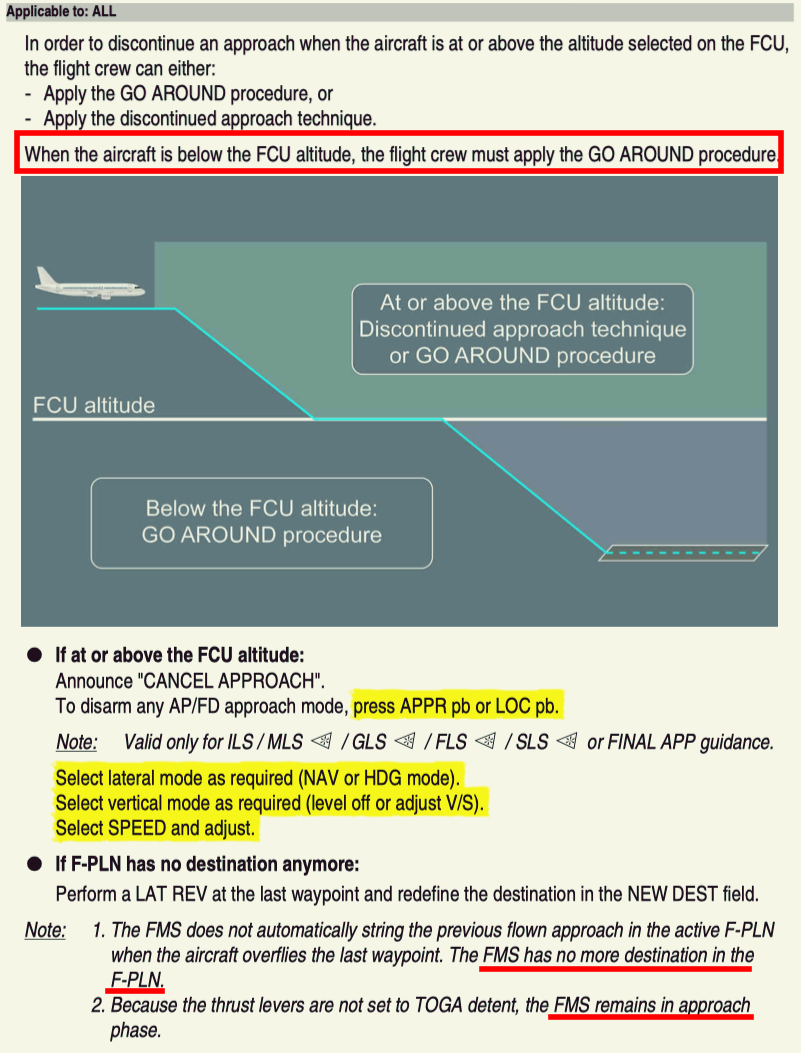 However, if the aircraft is below the FCU altitude, the flight crew must apply the GO AROUND procedure.