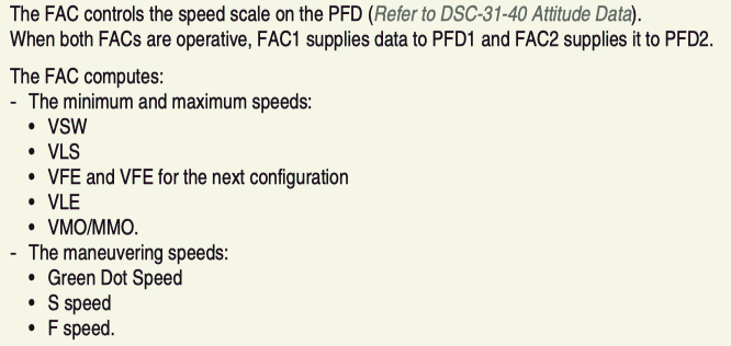 In other A320 aircraft types, the FAC calculates the operating speeds based on the gross weight entered in the Flight Management System (FMS). Consequently, the operating speed displayed on the PFD and the MCDU remains consistent and accurate.