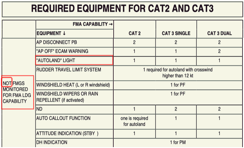 When referring to the Quick Reference Handbook (QRH), it specifies the required equipment for CAT II/ III operations. and The autoland light is not FMGS-monitored equipment.