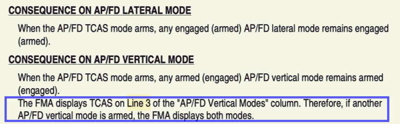 Unlike the aircraft without AP/FD modes, When the AP/FD TCAS mode engages, any engaged (armed) AP/FD lateral mode remains engaged (armed).