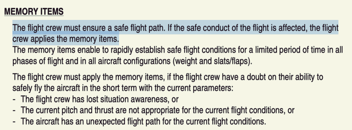 there are memory items for the a320 pilots which we have to apply A MEMORY ITEM, when the flight crew has no time to refer to the ECAM/QRH/FCOM to ensure a safe flight path.